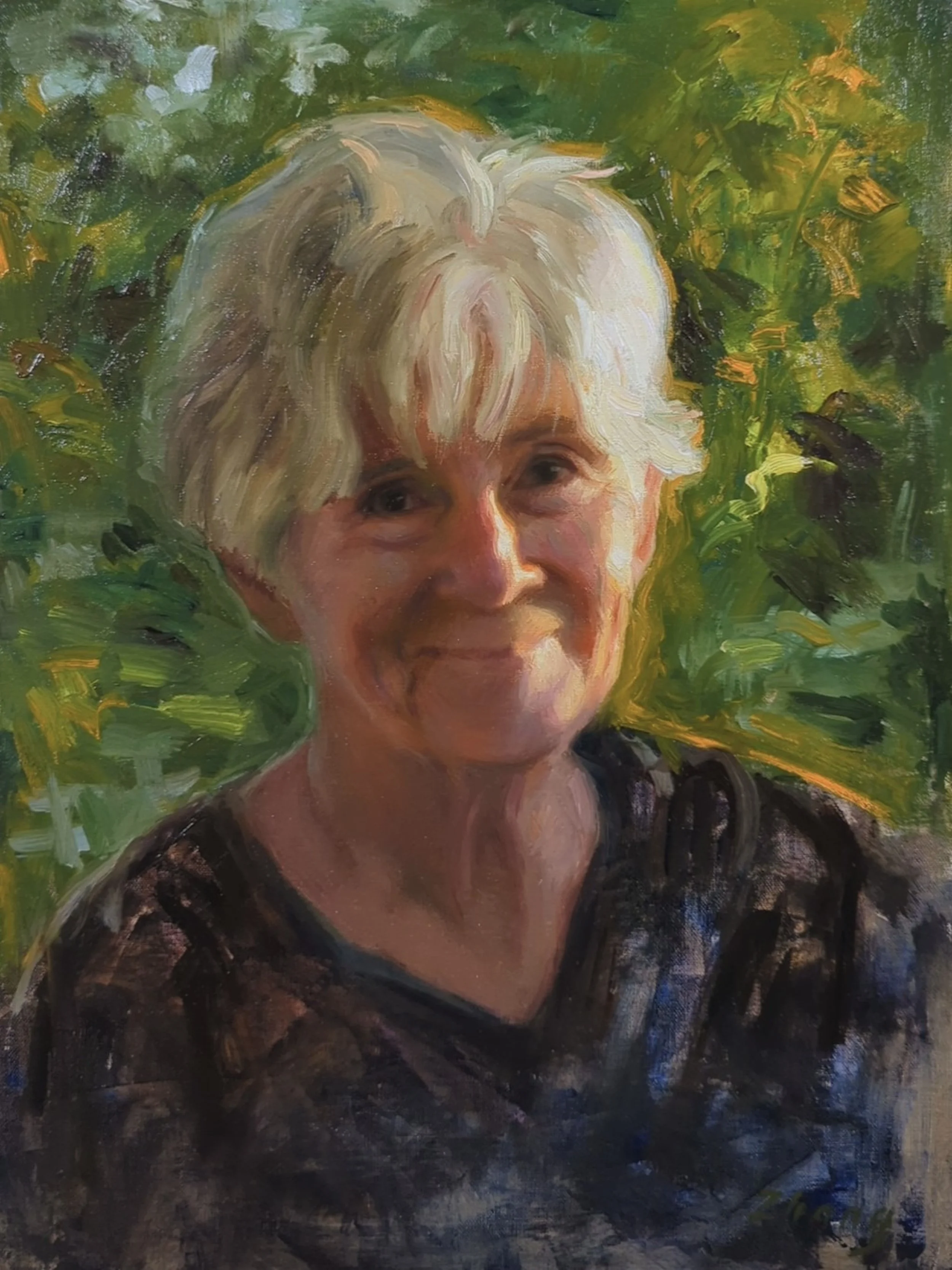 On the left is a portrait of Penny. I gifted it to her as a thank you for all the help and support she gave me to prepare for this show. I took the reference photo for this painting during our photoshoot. Penny was interacting with Sherman the whole time, but just for one second, she turned towards me and I snapped the shot. I can see a lot of her in this moment: warmth and kindness, years of wisdom, patience with me... and the golden rays of the setting sun on her side just glows. I knew I had to paint her in this moment. It's such a privilege as a portrait painter to be able to record the people we meet with our paint brushes, meanwhile a real challenge to shoot for what's beyond that likeness.